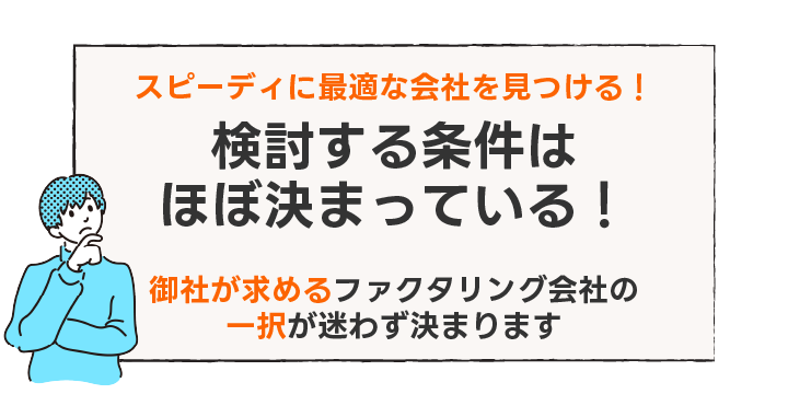 貴社に最適なファクタリングを最短で実現!手数料を最適化し、希望に合った優良業者を厳選ご紹介します。